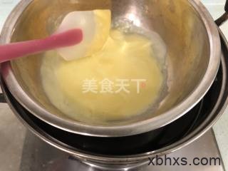 9、蛋黄倒入奶酪糊中,搅打均匀。(依然隔热水状态下。)