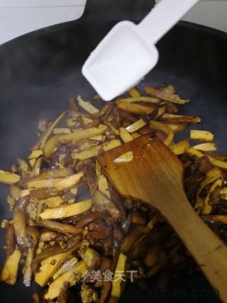 5、向锅中倒入茄条和香干翻炒几下。