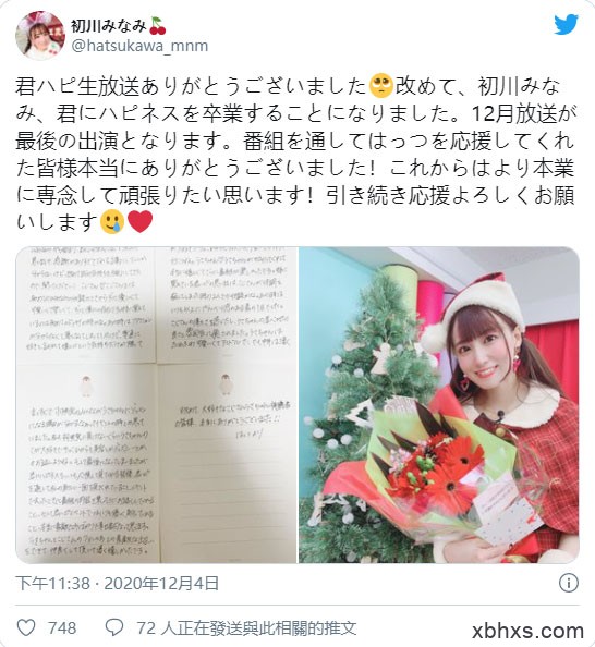 原本预定要在今年来到台湾参加TRE台北国际成人展的美少女「初川みなみ(初川南)」宣布自主持的节目「君にハピネス」毕业,在节目上另外两位主持人羽咲みはる(羽咲美晴)和小岛みなみ(小岛南)虽然不捨老战友离去,还是给予祝福⋯