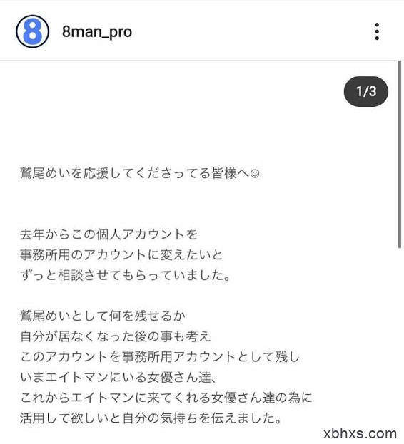 8MAN发了一篇公告,意思是说鹫尾めい(鹫尾芽衣)已经在考虑以后不做(AV女优)的事,所以决定即刻起将自己的IG变成事务所的帐号: