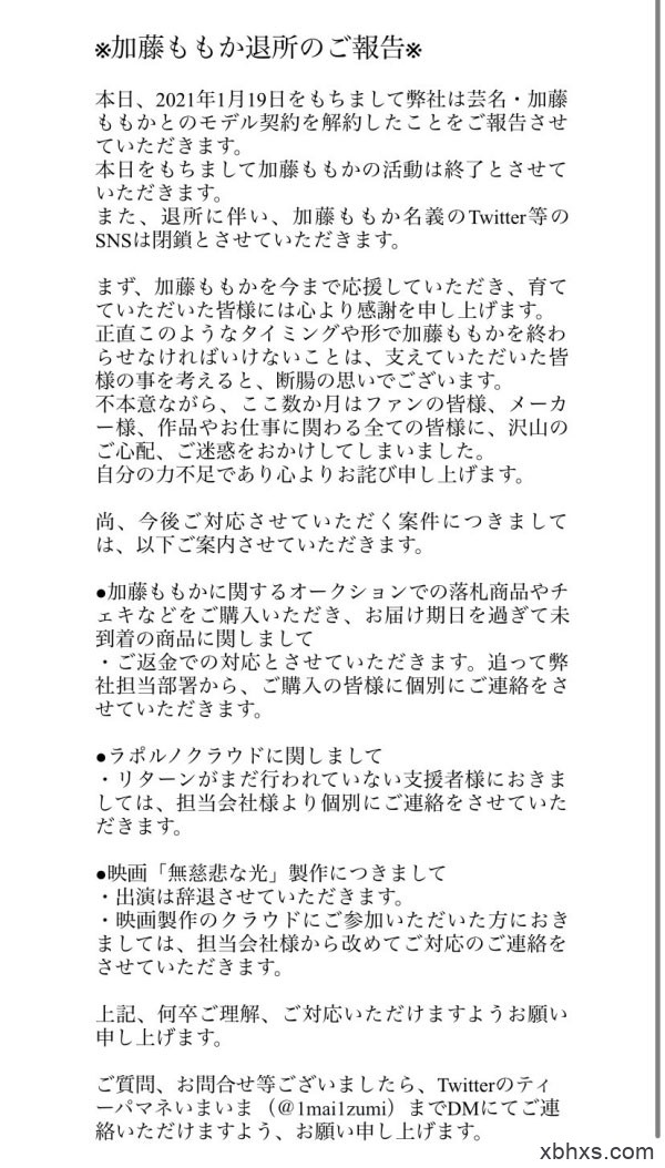 这一行女优来来去去是常态,一般事务所大多不会针对谁离开多说什么,但这纸声明不但说明了加藤ももか(加藤桃香)已经不再是经纪公司T-Powers的一员而且是即日起就切断双方的合作关係ー她不能再用加藤ももか(加藤桃香)的名字,twitter和IG也都不能用了,卖场的商品取消贩售,募资会有专人联络退钱事宜,原本讲好的工作也全部取消〜