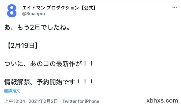 首先要关注的还是事务所エイトマン(8Man),他们在凌晨时更新了官方Twitter、告诉大家2月19日有个女孩的最新作品就要情报解禁,请大家记得预约: