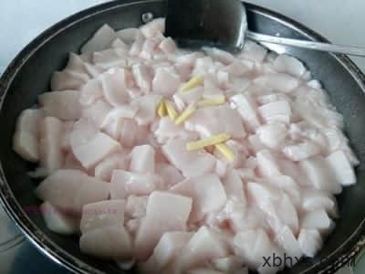 4.肥肉倒入锅里加姜,加腌到肥肉三分之二的清水,这样受热更加均匀