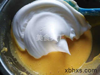 7、将三分之一蛋白霜放入蛋黄糊中,搅拌均匀。