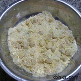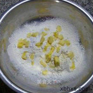 7、将低粉筛入大盆中,合入无铝泡打粉和剪碎的黄油。