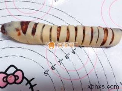 13、用锋利的刀在面团上切割,注意不要把底层割破,露出豆沙即可。