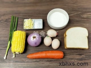 3、准备材料:吐司,胡萝卜,鸡蛋,玉米,芝士,洋葱,小葱,牛奶,黑胡椒,盐。
