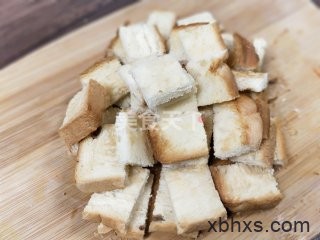 5、先将吐司用烤箱200度烤2分钟至有点干的状态,然后取出切成2厘米左右的块状(切块再烤也一样);