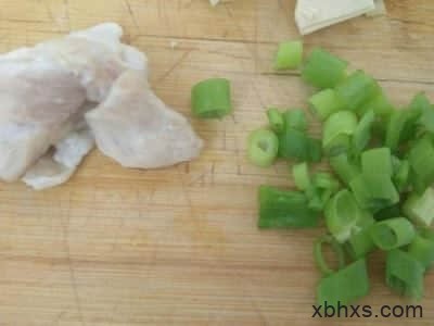 2.猪肉切片,葱切小段