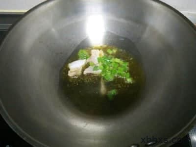 4.热锅下油,油热下猪肉和葱花,炒熟