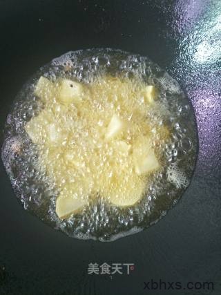 5、锅里放。菜籽油。七成油温时放入这个鱼块儿。炸完全熟透捞出。