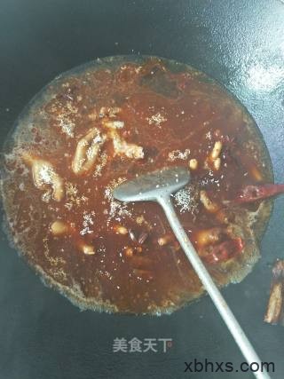9、放入豆瓣酱。生抽,老抽,蚝油翻炒均匀。放入。没过鸡爪的清水,大火煮沸。