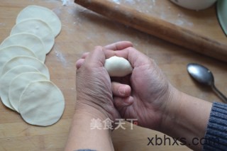 17、双手合拢,左手大拇指挑起双手捏皮成中间鼓起边薄的饺子生胚。