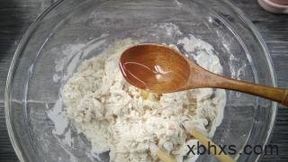 2、面粉加酵母粉,苏打粉一小撮盐,加常温水拌成絮状加入一勺食用油。