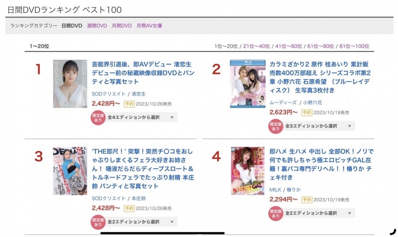虽然这一档WIll集团有很多强片,尤其石原希望、小野六花加上伊藤舞雪一起演出的漫改作品「カラミざかり2」实在太强,不过销售排行榜很明显地告诉我们,SOD Star的「渚恋生」才是王者⋯